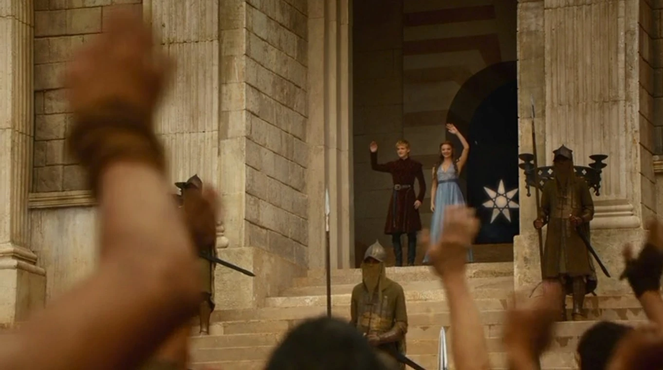 Joffrey, Margaery, Cersei, and Olenna Tyrell are visiting the Great Sept of Baelor, where the royal wedding will be held. Joffrey tells Margaery about the history of the dead Targaryen kings. Margaery feigns interest, then they hear a crowd of smallfolk outside. Margaery suggest they greet them, and Joffrey is reluctant but has the doors opened. Joffrey and Margaery step outside to a happy, cheering crowd, while Cersei looks on angrily.[22]