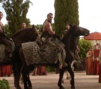 Illyrio and Prince Viserys Targaryen arrange the marriage of Viserys' sister Daenerys to Khal Drogo in return for Drogo supplying Dothraki troops to support Viserys' play for the Iron Throne of Westeros. Drogo agrees, but does not stipulate a time frame. Viserys notes the length of Drogo's braid: Dothraki have to cut off their hair when they are defeated, but Drogo's long hair suggests that he has never been defeated in battle. Viserys states that Drogo is a "savage" but also "one of the finest killers alive."[2]