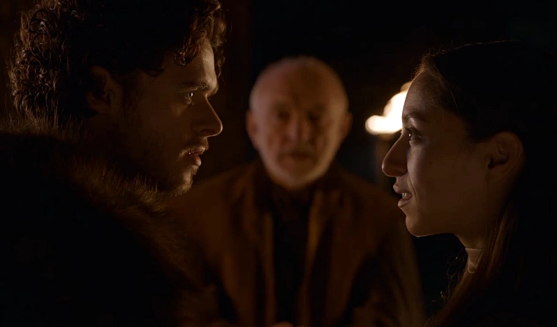 Robb is furious at the betrayal and orders Catelyn kept under guard. He sends men to find Jaime and devises a plan for Roose's bastard son; offer mercy to Theon's men if they deliver the Ironborn prince so they will abandon him, allowing him to retake Winterfell with minimal bloodshed. Talisa comforts Robb, revealing more of her past. He confesses not wanting to marry into House Frey and they sleep together.[19] Robb confesses his love for Talisa to Catelyn. Catelyn warns against betraying his oath to marry a daughter of House Frey. Robb rejects her counsel, and in a secret ceremony conducted by a Septon of the Faith of the Seven, he and Talisa secretly marry.[20]