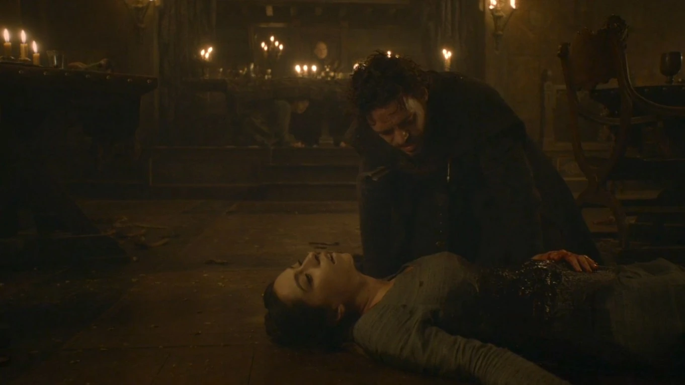 After they leave and the festivities begin to wind down, Catelyn becomes suspicious when she notices Black Walder Rivers close the banquet hall doors and the musicians in the gallery begin playing "The Rains of Castamere"- the song commemorating House Lannister's brutal elimination of House Reyne . Walder rises to make a toast to Robb, and Catelyn, seated beside Lord Roose Bolton, notices that the latter is wearing mail under his clothing. Realizing they are in a trap, Catelyn slaps Roose across the face and screams a warning to Robb, but by then it is too late. Lord Walder signals his men to attack. Lothar draws a knife and repeatedly stabs the pregnant Talisa in the stomach, fatally wounding her and killing their unborn child. Before he can react, Robb is shot by the musicians with crossbows several times and falls to the ground. Numerous other Stark men are killed by the assassins or Frey men. Robb crawls towards Talisa despite his injuries and manages to hold her in his arms, but he sees that she is dead.