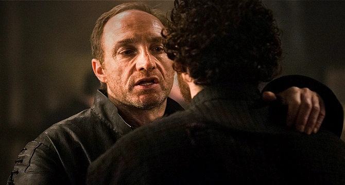 Despite the fact that he had previously participated in a blood ritual out of hope that it would lead to Robb's death, Stannis Baratheon remains disgusted at the manner of Robb's demise and offers to avenge him by killing Roose Bolton in an attempt to sway Jon Snow to his side.[32] Later, when Jon is signing request letters to various Houses for new recruits as the newly elected Lord Commander of the Night's Watch, he balks at sending one to Roose Bolton, reminding Samwell Tarly that Roose murdered his brother. Though Sam is aware of that and apologizes for presenting Jon with such an unsavory task, he reminds him that the Watch is in dire need of men and supplies, and they cannot get them without help from the Warden of the North. With disgust, Jon reluctantly signs the letter to the Boltons.[33]