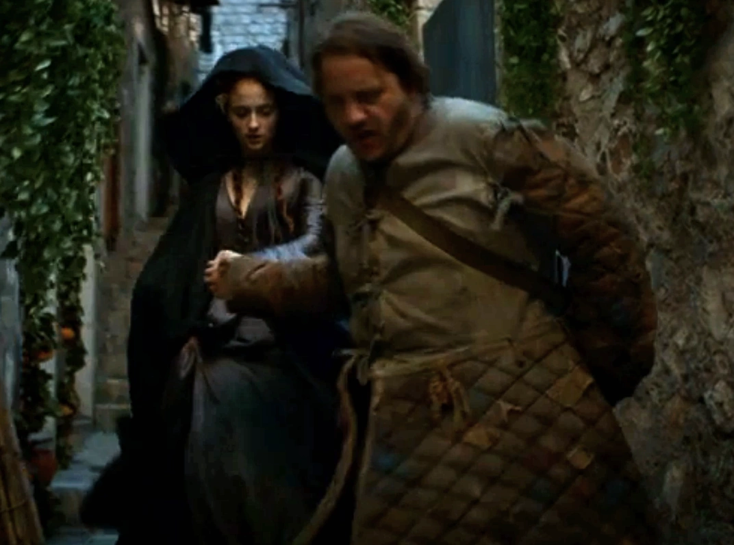 At the Hand's tournament, Sansa witnesses Ser Gregor Clegane killing Ser Hugh of the Vale during a joust. Littlefinger tells Sansa about how Gregor burned the face of his brother, Sandor, when they were very young. Sandor is Joffrey's bodyguard and Littlefinger advises against relaying the story to Sandor.[7]