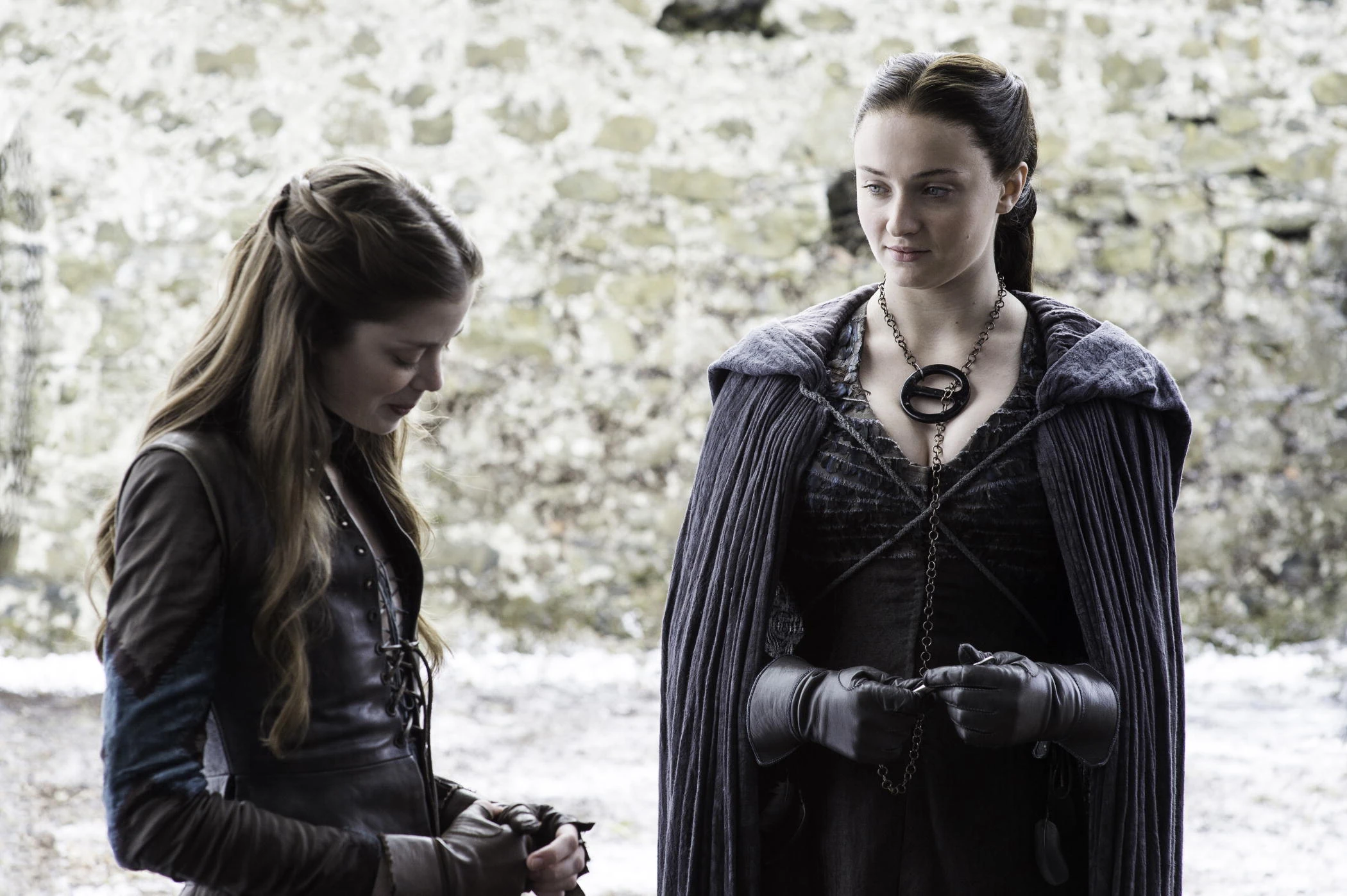 At a war meeting at Castle Black, Sansa and Jon discuss which of the Northern houses they can rely on to support them. As the Karstarks and Umbers have already sided with House Bolton, Ser Davos suggests asking House Manderly. When Jon decides to rally the two dozen houses still loyal to the Starks, Sansa informs him they can add House Tully to the list, but lies about how she acquired the information. After the meeting, Sansa plans to send Brienne to Riverrun, as the Boltons could intercept any raven sent there. Brienne is worried about leaving her alone, but Sansa assures her she trusts Jon and will be safe with him. Unconvinced, Brienne counters by asking Sansa why she lied to Jon about meeting with Baelish. Before riding south, Sansa gives Jon a new cloak styled after [their father's].[48]