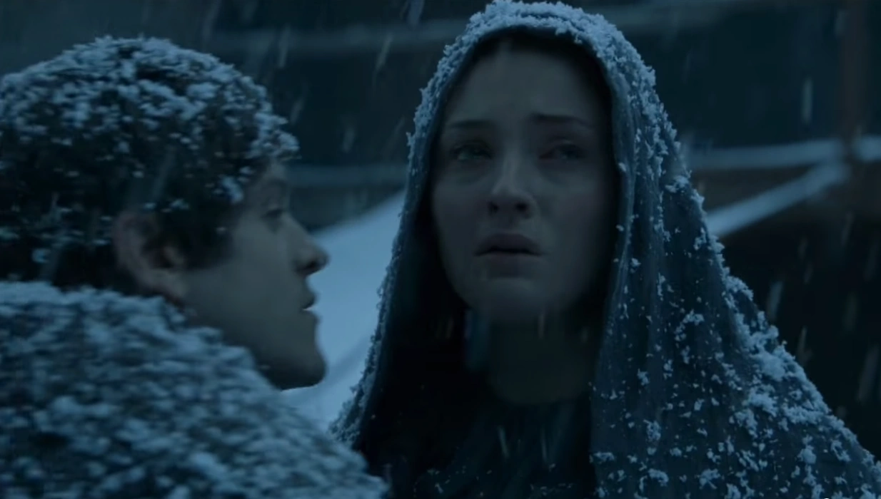 With Winterfell firmly under Stark control, Sansa joins Jon on the ramparts as he watches an exiled Melisandre heading south. He tells her that he is having her parents' room prepared for her. Although she protests that he should have it, he refuses because he is not a Stark. Sansa tells him that she thinks of him as one, but he still refuses and that she deserves it both as the lawful Lady of Winterfell and the one who won the battle for them. He then asks her about Littlefinger and whether they can trust him, which she insists that they cannot. Although he understands why she didn't tell him about Baelish, Jon insists that they have to trust each other completely from then on. He then gently kisses her on the forehead. As he turns to leave, a smiling Sansa tells him that a white raven arrived from the Citadel, announcing the arrival of winter as their father had always predicted. Jon returns her smile.