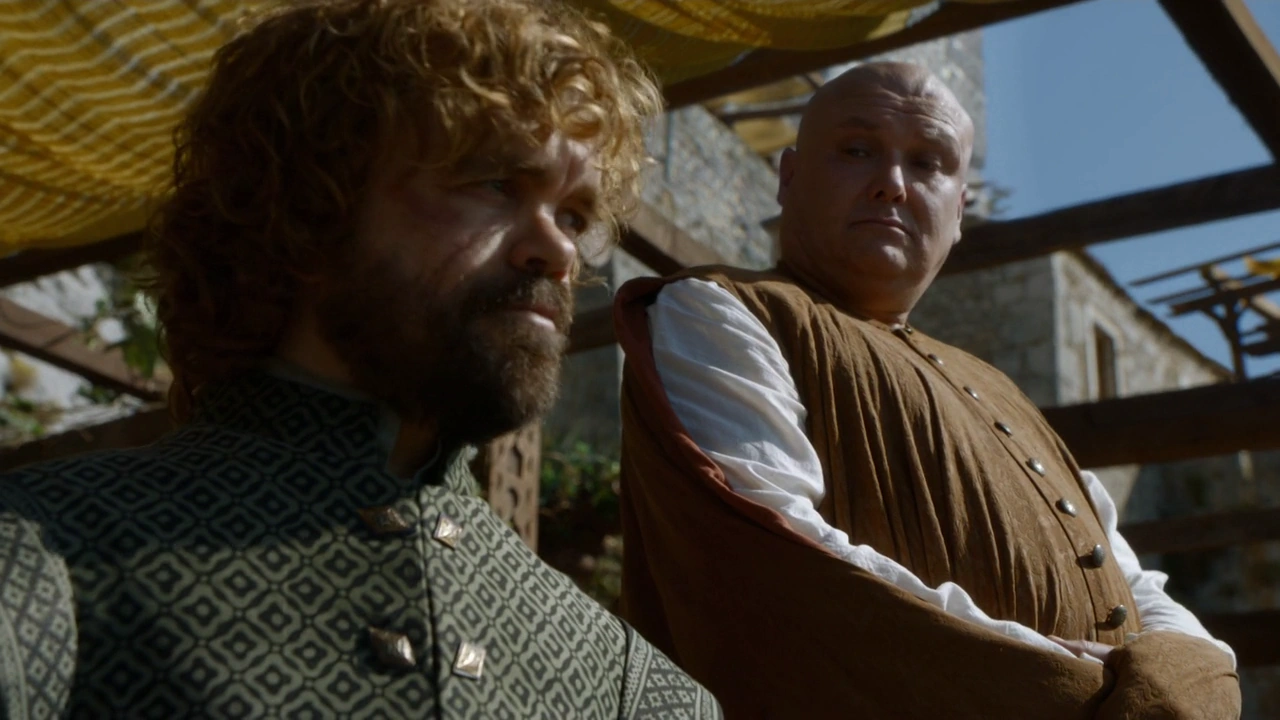 Later on, Tyrion watches Daario and Jorah depart Meereen to find Daenerys from atop the pyramid. He is joined by Varys, who playfully teases him for "abandoning" him and admits he found him through his little birds. Varys congratulates Tyrion for winning Daenerys's favor without him. Varys alludes to the political instability in Meereen, and the opportunities it presents for Tyrion. Through their bantering, they vow to help each other hold Meereen together. Tyrion then wholeheartedly admits that he missed Varys.[47]